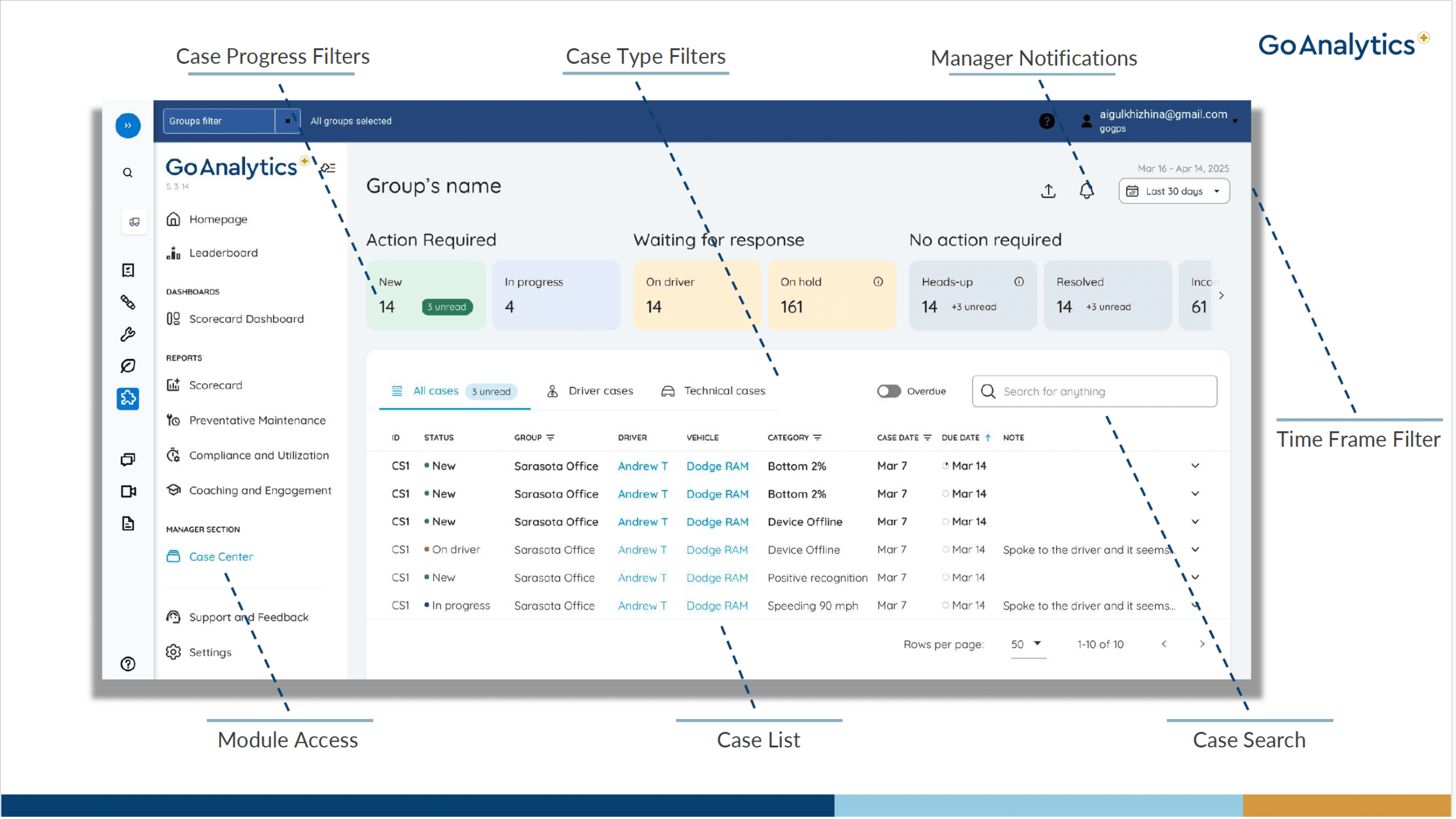 - Seamless GoAnalytics Integration: Built inside GoAnalytics, Case Center uses familiar dashboards, structure, and data sources—making adoption simple for any fleet.
