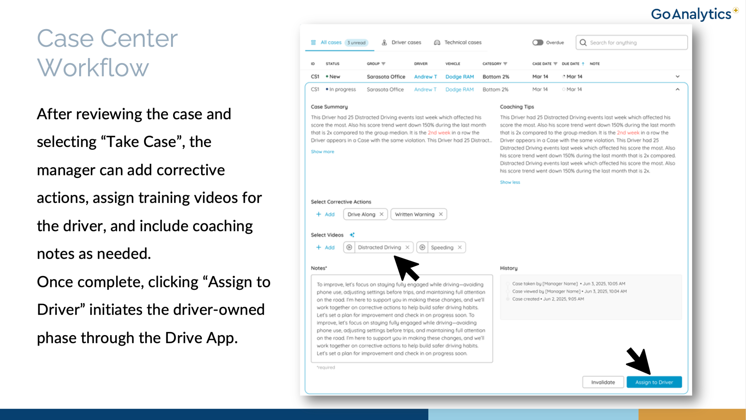 By turning GoAnalytics intelligence into actionable coaching workflows, Case Center helps fleets: