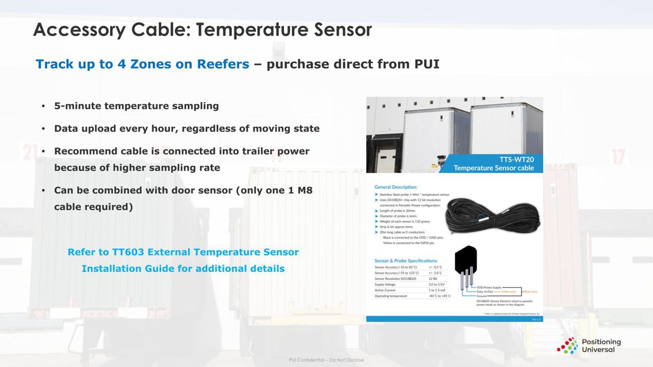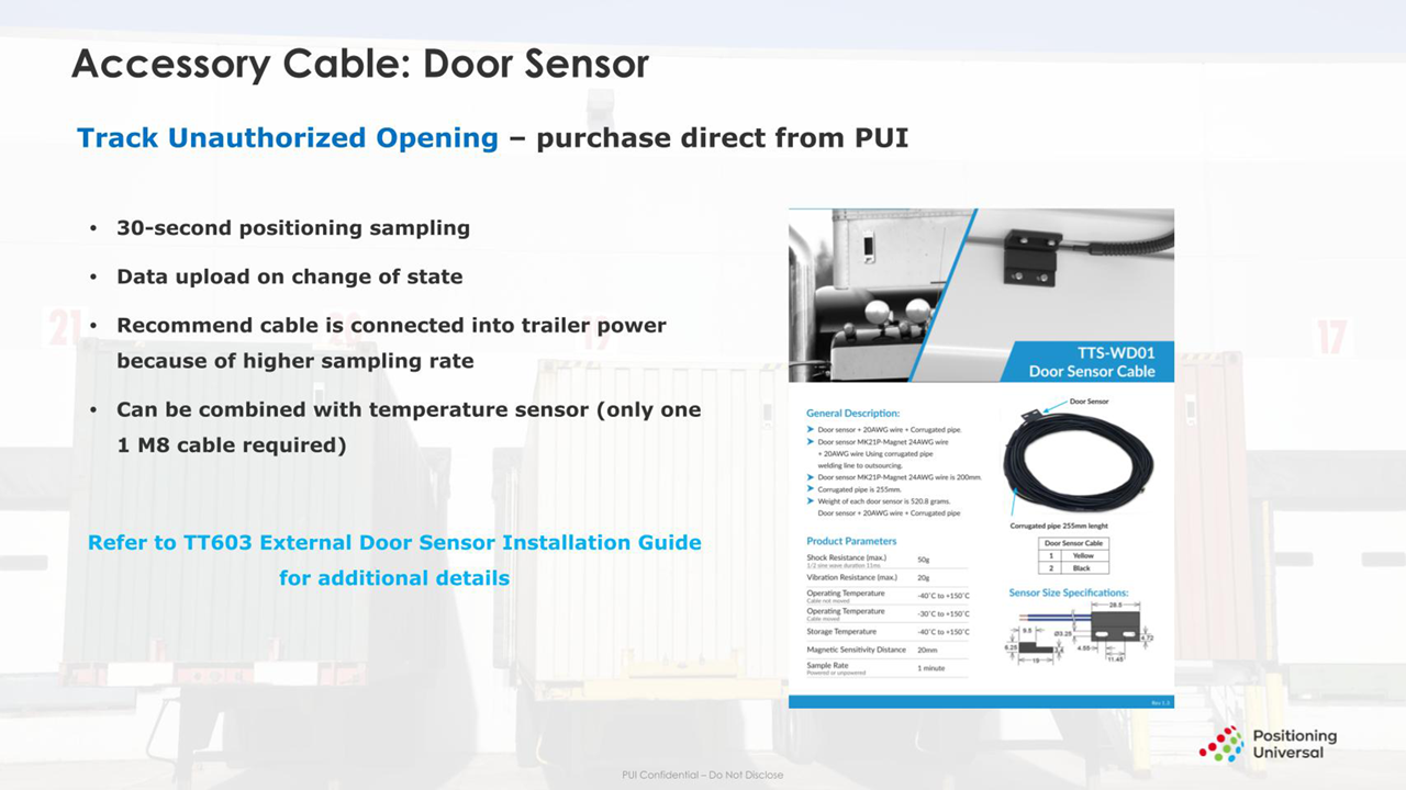 The TT603 is equipped with a connector that provides additional capabilities including door sensors, temperature monitoring, and tractor/asset power detection.