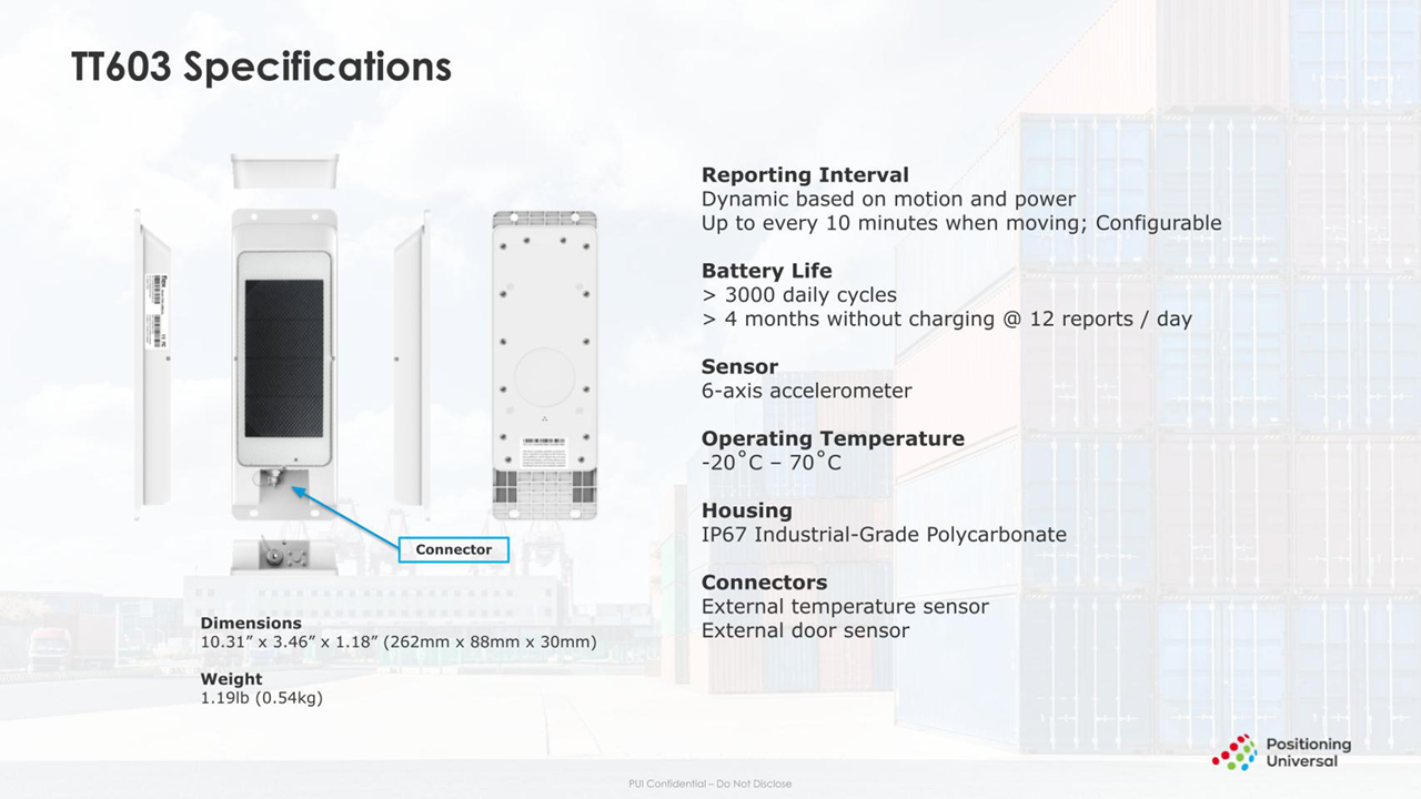 The TT603 Solar-Powered Asset Tracker is used to track trailers, containers, construction & mining equipment, generators, and various other assets. With its rugged construction, long battery life, and highly efficient solar cell, this tracker is purpose-built to withstand the most challenging operational environments. Use the collected data to stay on top of maintenance, pinpoint exactly how assets are being used to maximize their utilization and to provide companies with near-real-time visibility into their asset portfolios to enhance operational efficiencies and protect their valuable investments.