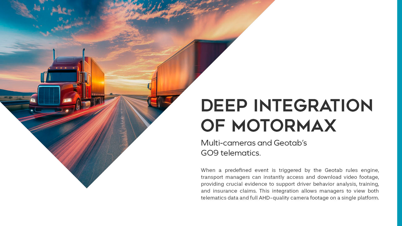 Designed to protect cargo and capture every critical incident, the system eliminates blind spots around your vehicle, ensuring that no important event goes unrecorded. By pairing high-definition video evidence with telematics data through seamless MyGeotab integration, fleet managers gain actionable insights into incidents, routes, and fleet performance—enabling faster, smarter decision-making. With rugged, weather-resistant cameras and reliable MDVR storage, Motormax turns every journey into a complete operational intelligence solution.